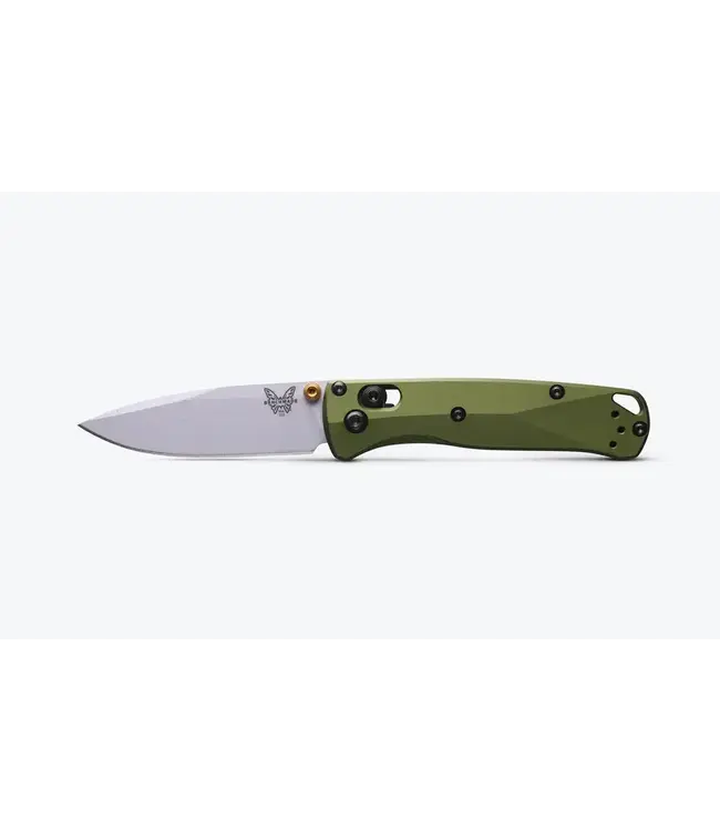 The 533SL-10 Mini Bugout features earthy, Woodland Green anodized aluminum handle scales, a fresh outdoor hue inspired by the vintage camping gear and cookware you might recognize back at basecamp. With the same slim, ergonomic and compact profile as normal Mini's, we advanced materials beyond the handle, building the 533SL-10 with a premium S90V stainless steel blade with a Crushed Silver Cerakote finish, and a pop of color, found in its gold anodized thumb stud and barrel spacer.