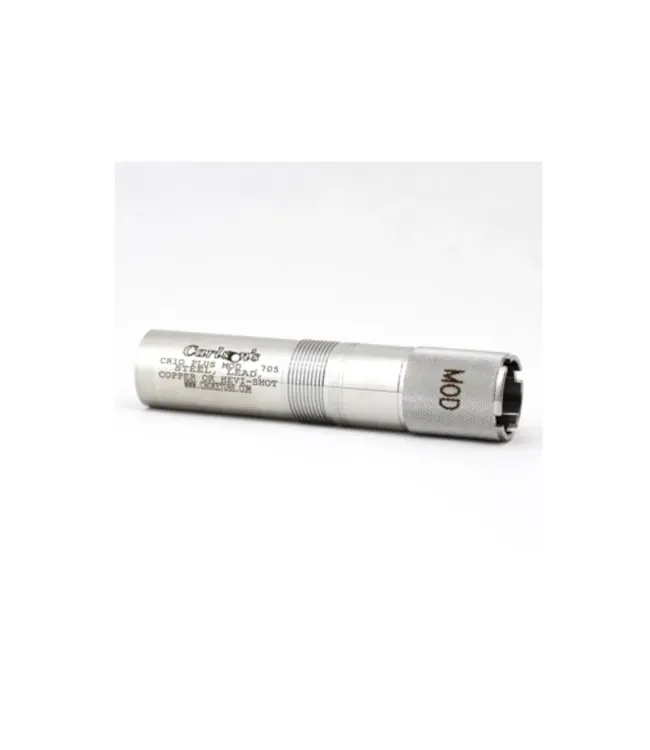Crio/Crio Plus - Carlson's Sporting Clays Choke Tubes are made from 17-4 stainless and precision machined to produce a choke tube that patterns better than standard choke tubes. These choke tubes feature a 25% larger parallel section in the choke thus throwing more consistent patterns than conventional choke tubes. Each choke tube is knurled on the end to allow for quick and easy removal. Each choke tube has the constriction laser marked on the end for easy reference. These choke tubes are backed by Carlson's lifetime warranty. Lead shot, Steel Shot, Copperplated Shot, Nickel Shot, Hevi-Shotshells, and Buck Shot can be used in Carlson's Sporting Clay Choke Tubes. Steel shot larger than BB should not be used in any Sporting Clays Choke Tube tighter than Full Constriction. Carlson's Sporting Clays Choke Tubes will throw tighter/denser patterns than Flush Mount Choke Tubes due to a longer parallel section. Fits Newer Benelli Models.