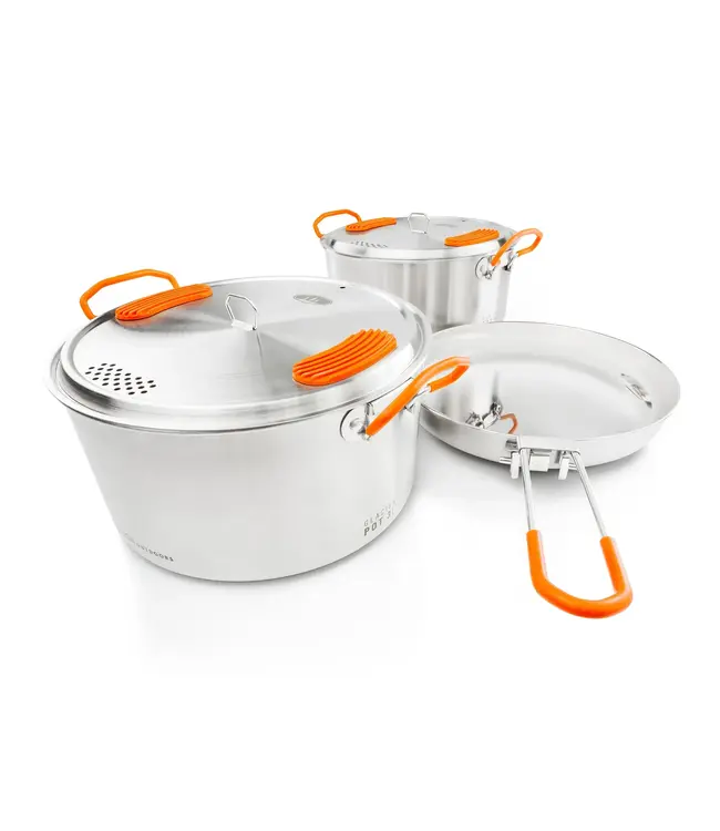 The brushed stainless washes up easily, helps eliminate hot spots, and can easily handle direct cooking on campfires and coals. And everything nests together into a mesh stuff sack so it won’t hog space in your gear box, trunk or trailer.