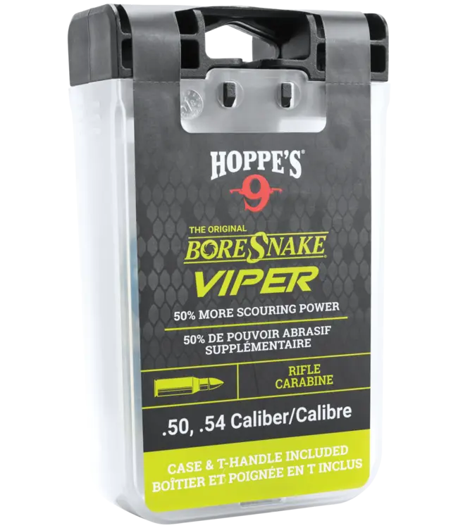 The Hoppe's Boresnake Viper takes the technology of the original Boresnake and increases the cleaning power by adding an additional set of brushes. This one-pass bore cleaning solution uses integrated bronze brushes to scrub out carbon fouling, while the tail clears the barrel of loose debris with a surface area 160x larger than a standard patch. It also has an integrated cone-shaped bore guide on the leading end and the brass weight has the caliber stamped on it. The Boresnake Viper Den now includes a T-handle for easier pull through of your pistol and a reusable carrying case that you can keep in your range bag or backpack to protect your Boresnake Viper during transport.