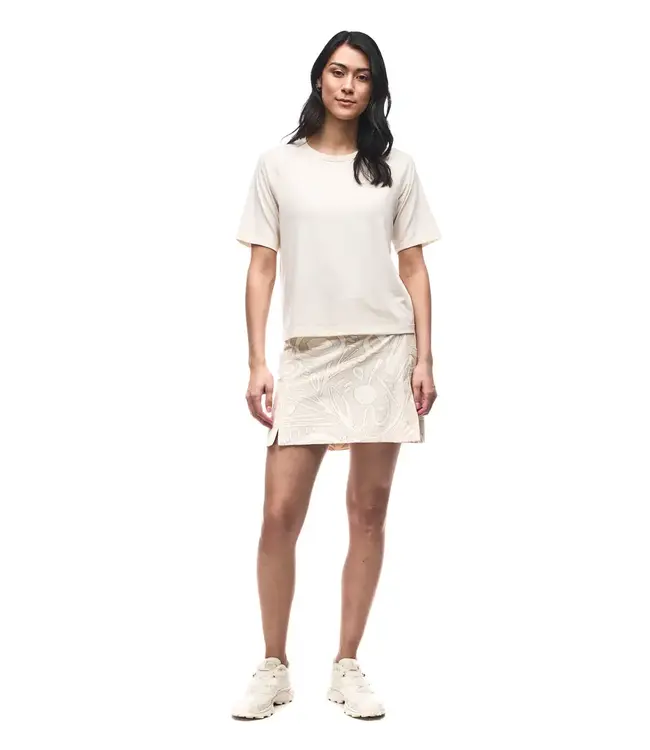 A crewneck t-shirt with a loose, relaxed fit. The raglan sleeves have no seam along the shoulder, making this tee a chafe-free dream under backpack straps. Loose, relaxed fit. Raglan sleeves with high elbow length. Hits at the high hips. The Lyocell in Indyeva's jersey collection makes this piece so soft, it feels great against your skin all day.