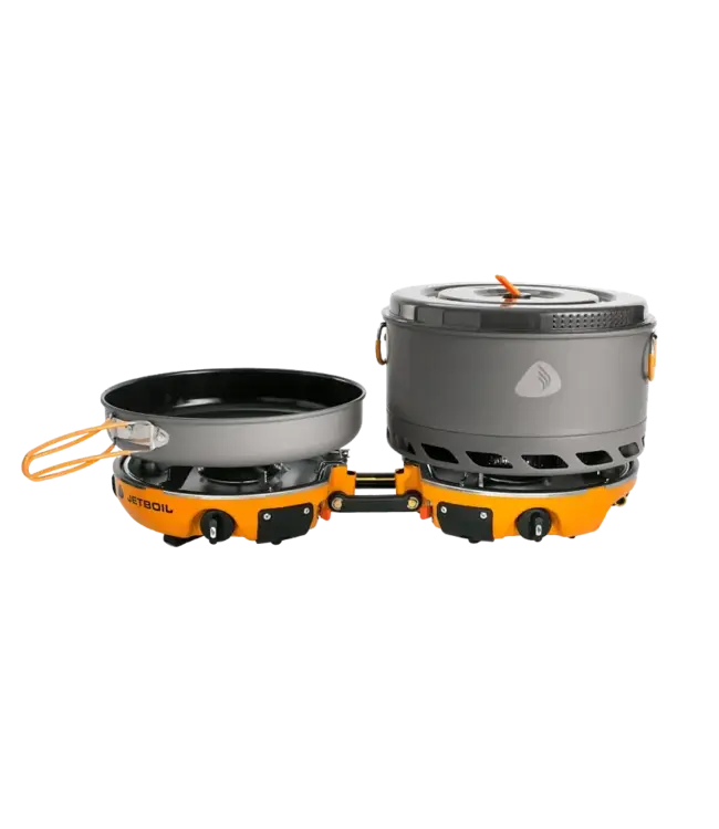 The award-winning Genesis Basecamp System is the ultimate all-in-one backcountry cooking system, stowing neatly into itself and fitting snugly among your gear. Jetboil's dual-burner design functions as a standalone stove, or couples with other JetLink-compatible stoves or a Luna Satellite Burner to create an outdoor cooking range. The system's 5-liter Jetboil FluxPot and 10-inch ceramic-coated nonstick fry pan give you everything you need to set a new benchmark for basecamp cooking. A beastly 10,000 BTU heating system boils water in just over three minutes—perfect for melting snow or making coffee. An attachable windscreen improves the system's performance in any weather; regulated for consistent performance down to 20 degrees F (-6 degrees C). Includes system carrying bag with pocket for regulator; compatible with standard 16.4-ounce propane bottle; weighs 9.1 pounds.