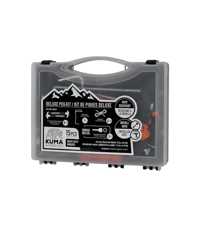 When the wind picks up and the weather turns, you want camp to feel solid, secure and stress-free. That’s why the Deluxe Peg Kit needs to have a permanent spot in your gear bag! Built for campers who want to be ready for anything, this kit keeps tents, shelters and gazebos anchored no matter where you set up. Whether you’re camping on hard-packed ground and need to use the drill bit, want to be prepared with extra guy lines “just in case” or need a little help pulling out the pegs at the end of the trip with the Peg Extractor - having a strong, dependable kit that does it all will make the whole camping experience easier. Packaged in a handy carry case to keep everything together and organized, it’s the kind of kit you’ll reach for again and again. Add a Deluxe Peg Kit for peace of mind on your next outdoor adventure because a campsite that stays put lets you relax, explore, and enjoy the outdoors without worry.