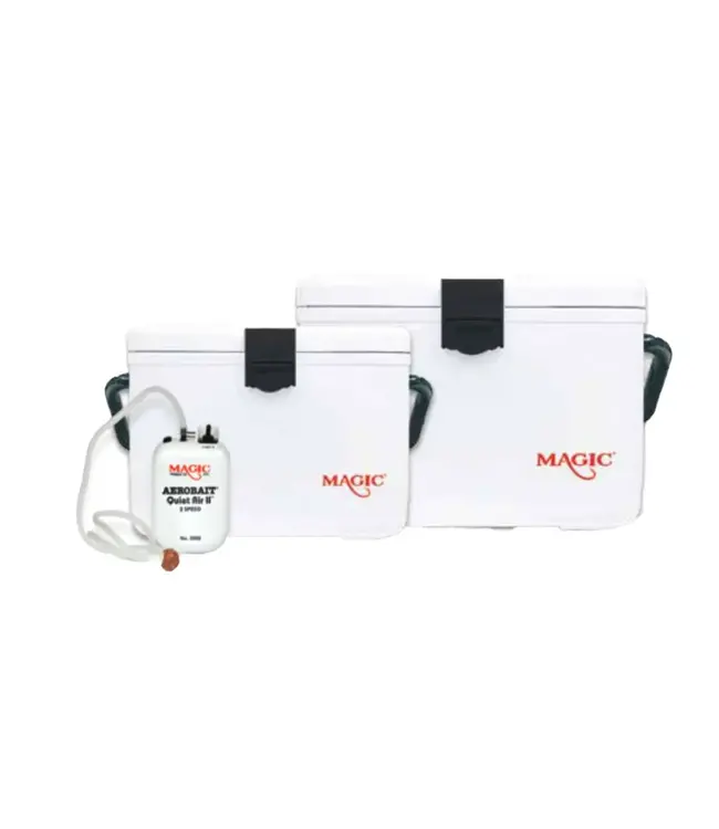 Cooler with heavy-duty, injection molded body. 2-speed aerator and bait net included. Metal handle and non-slip feet. Great for minnows, shrimp and other live bait.