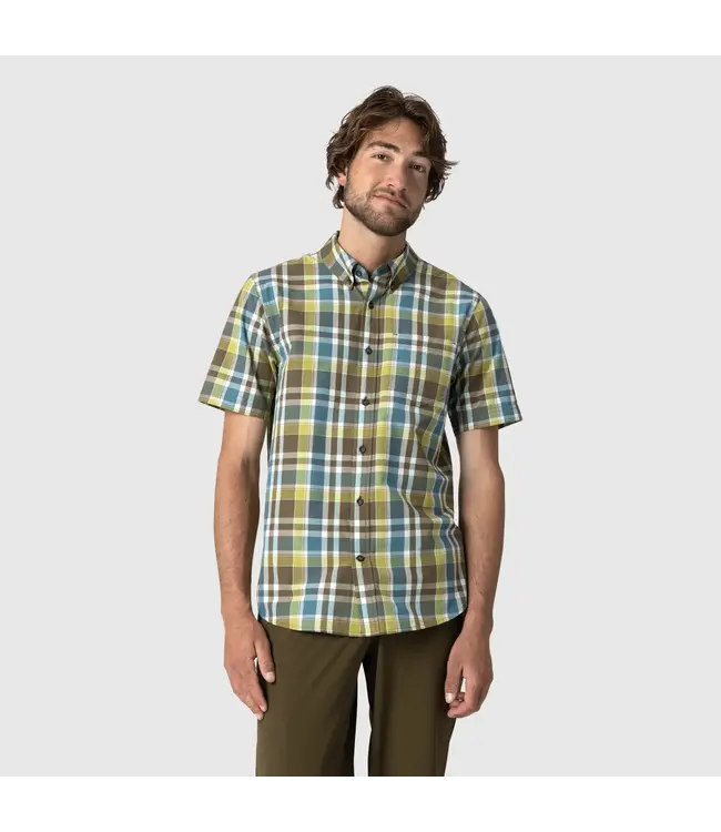 The Rooftop Short Sleeve Shirt is made with a breathable organic cotton blend, perfect for climbing at the crag, hanging around camp, or meeting up with friends on the weekend.