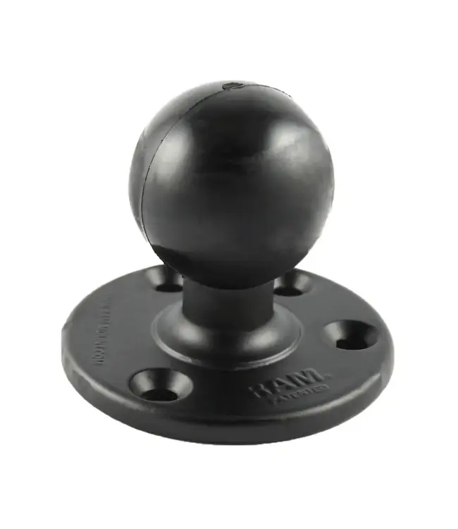 The RAM Large Round Plate with Ball – D Size (RAM-D-202U) features a 3.68" diameter round plate with an integrated 2.25" rubber ball. Compatible with all D size RAM components, this base can be attached to a device with a matching hole pattern or drilled down to a flat surface for permanent installation. The pre-drilled hole pattern includes two holes at 180 degrees and three holes at 120 degrees, providing multiple mounting options.