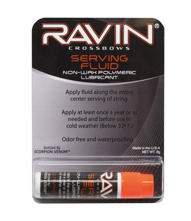 The Apex Hunter knows the value of maintaining their weapon. Ravin Serving Fluid is critical in proper maintenance and care for your Ravin. This non-wax polymeric lubricant should be applied to the center serving of the string.