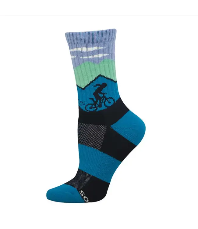 Find your flow and keep rolling. Ride On, Ride On, Ride On celebrates the spirit of the ride with a bold mountain biker racing along a hillside trail. Whether you're out chasing switchbacks or dreaming of singletrack, this Merino wool pair has your back (and feet) with breathable mesh, dynamic arch support, and cushion where it counts.