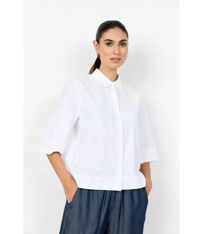 NETTI 118 Shirt is crafted with 53% recycled polyester and 47% organic cotton. The shirt features a classic collar, concealed buttons, and a straight hem, along with short wide sleeves. Pair it with tailored trousers or a casual skirt for an elegant style.